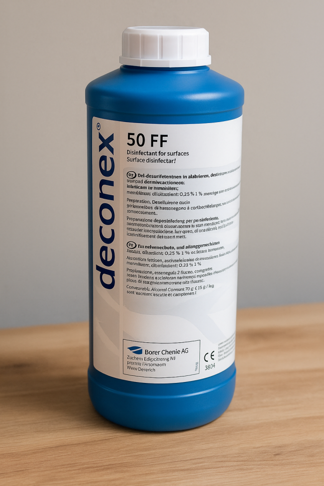 Деконекс Дезинфектант за повърхности 50FF – концентрат за дезинфекция на инструменти и повърхности. Без формалдехид, ефективен срещу хепатит B и HIV. Подходящ за професионална употреба.