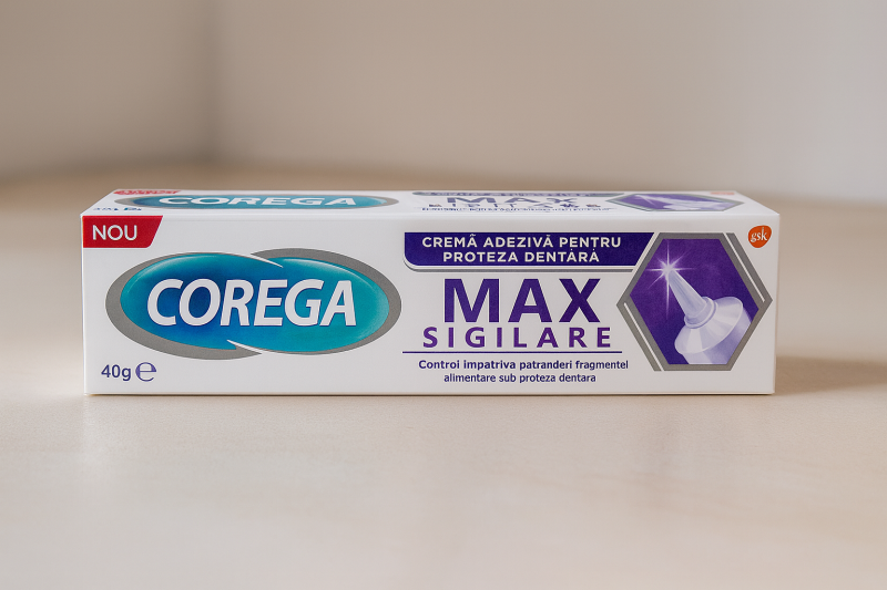 Corega Max Sigilare - нова подобрена формула фиксиращ крем за протези, осигуряващ стабилност и оптимална защита от попадане на храна.