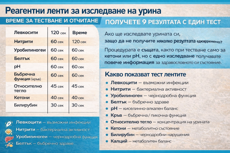 Показател Време Левкоцити 120 сек Нитрити 60 сек Уробилиноген 60 сек Белтък 60 сек pH 60 сек Бъбречна функция (кръв) 60 сек Относително тегло 45 сек Кетони 40 сек Билирубин 30 сек