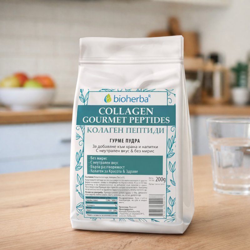 Колаген Пептиди Гурме Пудра Bioherba, 200 гр. – висококачествени колагенови пептиди с неутрален вкус и бърза разтворимост, подходящи за добавяне към напитки и храни за подкрепа на кожа, коса и нокти.
